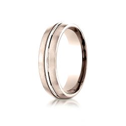This 14 Karat Rose 6mm Comfort-fit Satin-finished Carved Design Band Features A High Polished Cut Along The Center.