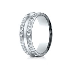 14k White Gold 7.5mm Comfort Fit Hammered Finish Center Cut Design Band