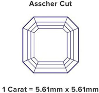 ROSI generally recommends a color of H for an Asscher cut diamond: the flashing facets will still look almost colorless. Clarity should be at least VS2 (or better whenever possible.) ROSI recommends a ratio of 1.00 to 1.05 to keep the square silhouette.