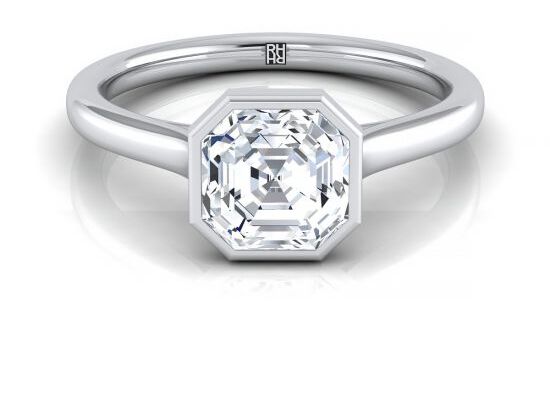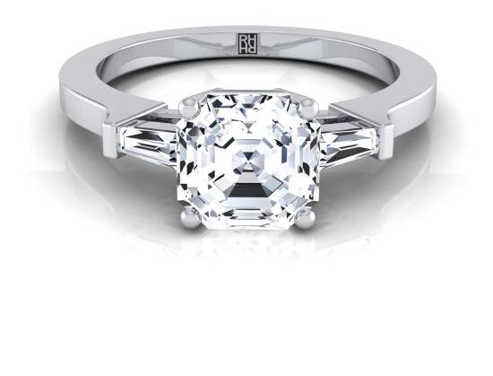 Our customer’s favorite setting for an Asscher cut engagement ring is a refined Asscher cut solitaire with a diamond band. For something a bit more intricate, an Asscher cut halo engagement ring has extra detail (and extra diamonds.). Because this cut is sleek and minimal, many brides also choose a simple solitaire: a bezel-set Asscher cut engagement ring is particularly sleek. Three stone styles are also popular, especially an Asscher cut engagement ring with tapered baguettes on each side.