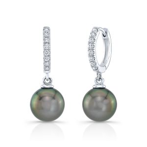 Black Pearl And Diamond Straight Dangle Earrings With Huggie Closures In 14k White Gold (8.0-8.5mm) (si)