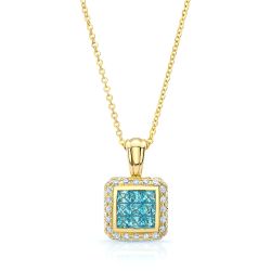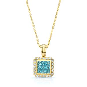 An Elegant Square Invisible Blue Topaz Gemstones Highlighted By 0.65 Ctw Round Brilliant Diamonds Pave Set In A Classic 14k Yellow Gold Pendant Setting. Includes A 17 Inch Rolo Chain