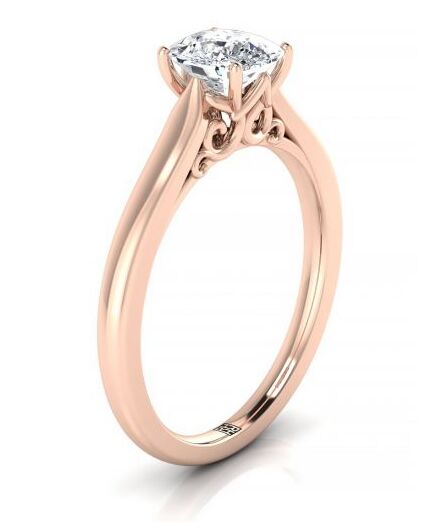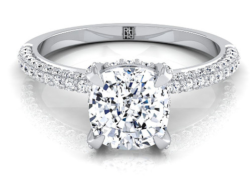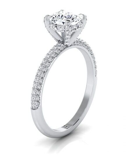 Our customers’ favorite setting for cushion cut engagement rings is simple cushion cut diamond solitaire with a delicate pave band. Delicate micropave halo cushion engagement rings are also popular. Meghan Markle’s three stone cushion cut engagement ring with two round brilliant diamonds on the sides has made this classic combination fashionable again.