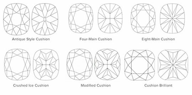 The variety that we love so much means it is a bit more complicated to compare cushion cut diamonds than any other diamond shape. Here are just a few of the different facet patterns of cushion cut diamonds that you’ll see on the market.