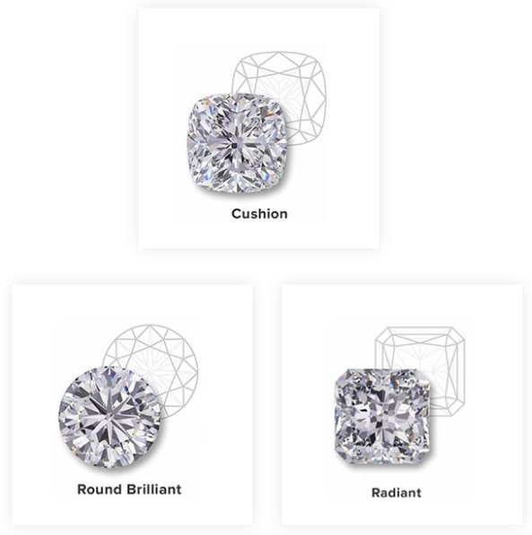 The three diamond shapes that are most similar to a cushion cut are round diamonds and radiant cut diamonds. Round brilliant diamonds are more common than a cushion cut so you lose the unique factor but they are often more bright than a standard cushion diamond. The round brilliant is less unique but it is easier to shop for, since all round brilliant diamonds look almost the same. A round cut will also cost more per carat than a cushion cut.