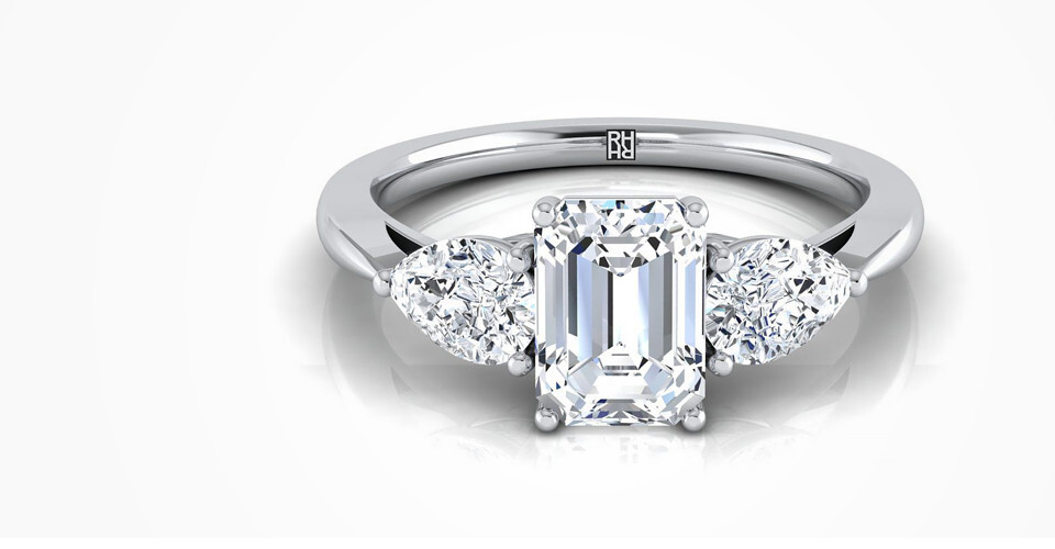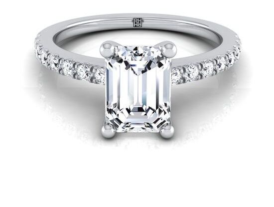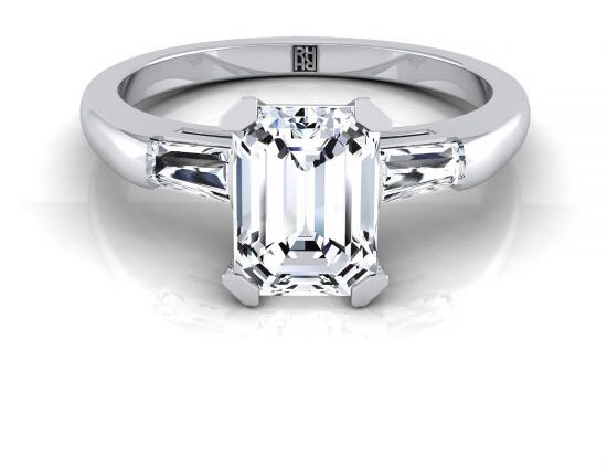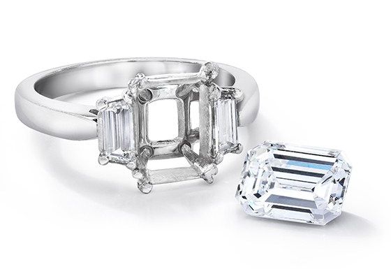 Our customer’s favorite setting for an emerald cut engagement ring is a refined emerald cut solitaire with a pave band. For something a bit more intricate, an emerald cut halo engagement ring has extra detail (and extra diamonds.). Because this cut is sleek and minimal, many brides also choose a simple solitaire: a bezel set emerald cut engagement ring is particularly sleek. Three stone styles are also popular, especially an emerald cut engagement ring with tapered baguettes on each side, which is the style of the famous Jennifer Lopez emerald cut ring.