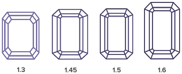 ROSI generally recommends a color of H for an emerald cut diamond: the flashing facets will still look almost colorless. Clarity should be at least SI1 (or better whenever possible.) The most visible factor in the appearance of your emerald cut is the length to width ratio. ROSI recommends a ratio of 1.3 to 1.5, which gives you a pleasing rectangular shape.