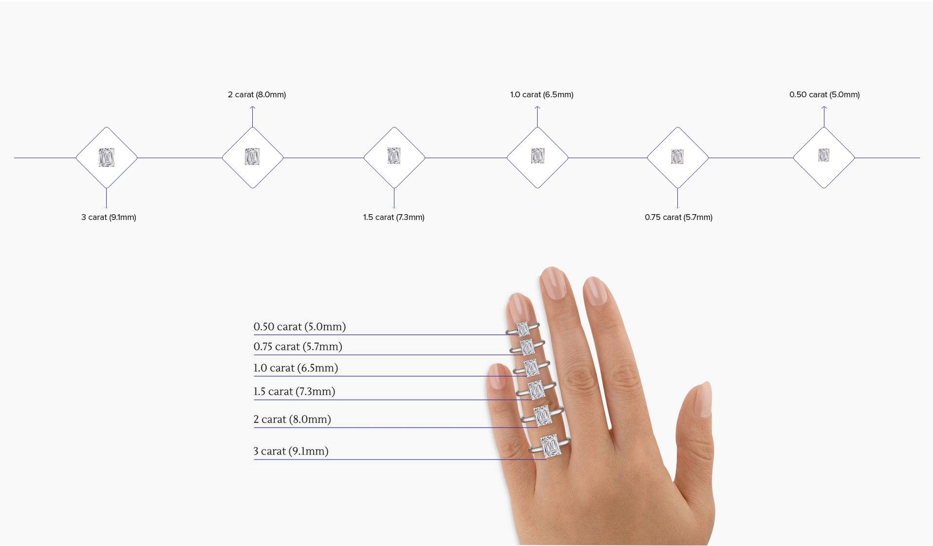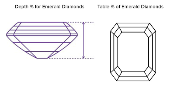 ROSI generally recommends a depth percentage between 61 to 68, which is the best balance between brilliance and size (the less depth, the larger your emerald cut diamond will appear.) ROSI usually recommends a table percentage of 60-69. ROSI always recommends very good to excellent polish and a very good to excellent symmetry, which together indicate a well-crafted diamond.