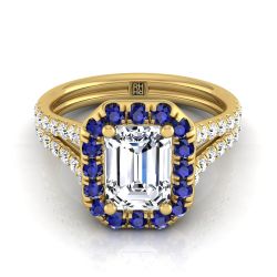 An Elegant Statement Of Style, This Emerald Cut Diamond With Sapphire Accented Halo Engagement Ring Showcases Brilliant Cut Diamonds (h-i/vs 0.40ctw) With An Exquisite Pave Split Shank Mounted In A 18k Yellow Gold Setting.