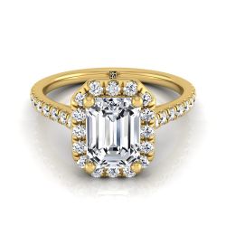 14K Yellow Gold Emerald Cut Classic French Pave Halo and Linear Engagement Ring -3/8ctw
