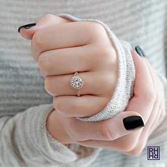 Halo engagement rings are popular because they extra ring of diamonds around the center diamond adds detail and sparkle (and it doesn’t hurt that this style also makes your center stone look larger too.) Halo engagement ring designs can be subtle, with small diamonds or more like a cluster with larger diamonds. We’re also noticing demand for fancy halo styles shaped like flowers or stars or with larger diamonds at the compass points. Vintage style engagement rings with halos have all the charm of antique rings with the advantages of a new made-to-order ring.