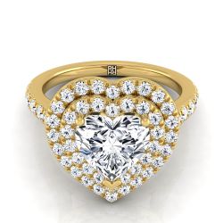 14K Yellow Gold Heart Shape Center Double Pave Halo with Linear Diamond Engagement Ring -7/8ctw