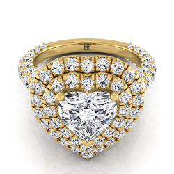 18K Yellow Gold Heart Shape Center Diamond Bold and Fancy Double Halo French Pave Engagement Ring -2ctw
