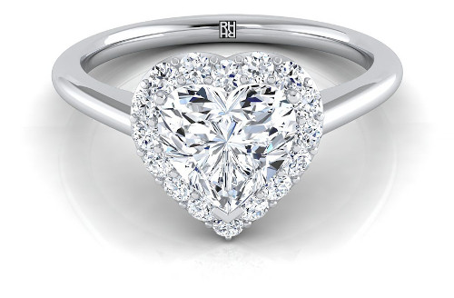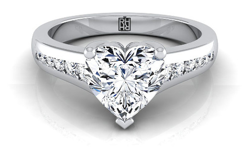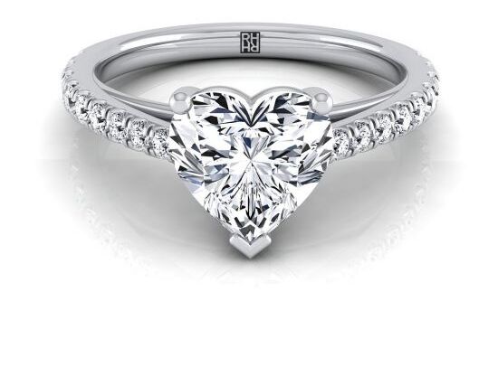 Our customers’ favorite setting for heart engagement rings is an elegant heart shaped diamond solitaire with a diamond band. (Remember to look for a V-shaped prong to protect the point.) If you prefer a classic look, a heart halo engagement ring has extra diamonds and extra sparkle. Because the heart is so distinctive, it also is perfect set a simple solitaire engagement ring. The most popular three stone heart engagement rings have tapered baguettes on the sides. No matter which way you set your heart shaped diamond, unless it is surrounded by a halo, be sure to protect the point with a v-shaped prong.
