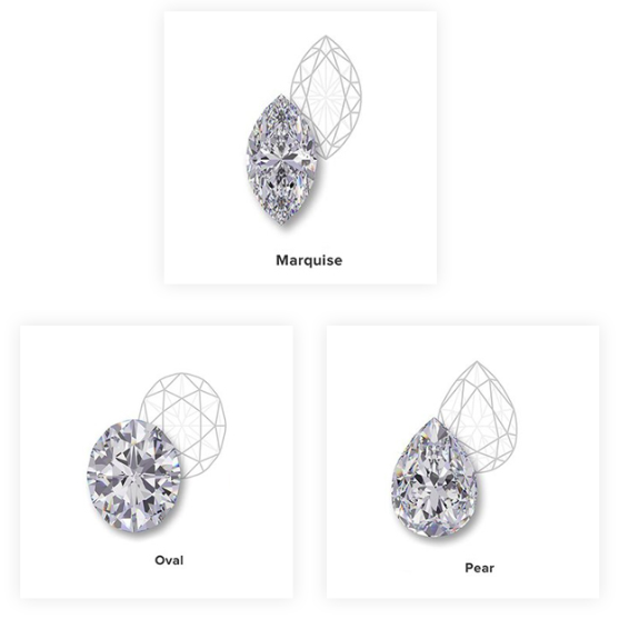 Pear shaped diamonds are as dramatic as heart shapes. They have a very similar shape except for the cleft but pear shapes are more elongated with a finger-lengthening effect. Unlike heart shapes, which have a top and bottom, pear shaped diamonds can be worn either with the point up or the point down.