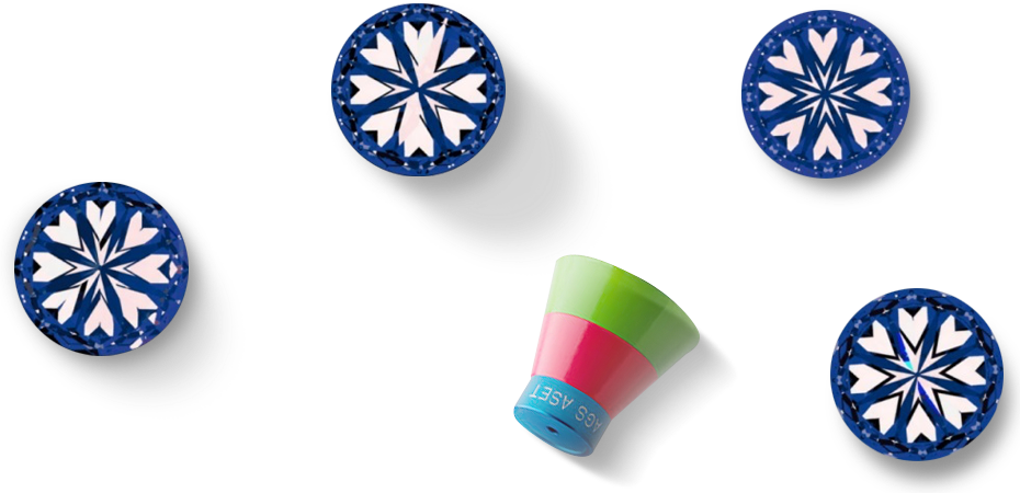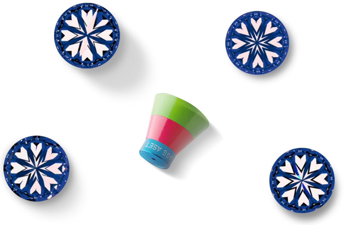 The cut quality of Hearts & Arrows Diamonds can be seen directly by looking through a ideal scope or ASET viewer, which is a tool used to grade cut at the American Gem Society Laboratories. (Compare this to the way cut quality is assessed for other ideal cut diamonds, which is estimated by looking at proportions and the polish quality, two good indirect indicators for how diamonds will handle light.)