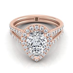 14K Rose Gold Pear Shape Center Diamond Halo Two Row Pavé Split Shank Engagement Ring -7/8ctw