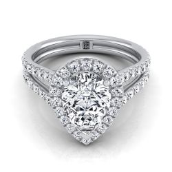 18K White Gold Pear Shape Center Diamond Halo Two Row Pavé Split Shank Engagement Ring -7/8ctw