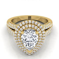 14K Yellow Gold Pear Shape Center Extraordinary Three Tier Diamond Halo Crown Engagement Ring -7/8ctw