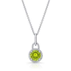 Lovely Halo Doorknocker Style Pendant Showcases A 7mm Round Peridot Center Stone Accented By 0.12ctw Of Round Brilliant Diamonds Set In 14k White Gold On A 17-inch Rolo Chain