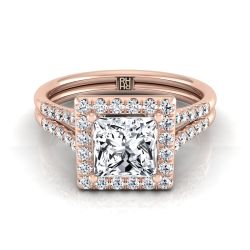 14K Rose Gold Princess Cut French Pave Split Shank Halo Engagement Ring -3/8ctw