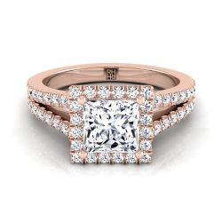14K Rose Gold Princess Cut Diamond Halo Center with French Pave Split Shank Engagement Ring -3/8ctw