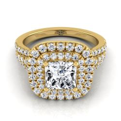 18K Yellow Gold Princess Cut Diamond Four Row Split Shank Pave Double Halo Diamond Engagement Ring -7/8ctw