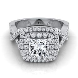 Platinum Princess Cut Diamond Twist French Pave Double Halo Diamond Engagement Ring -1/2ctw