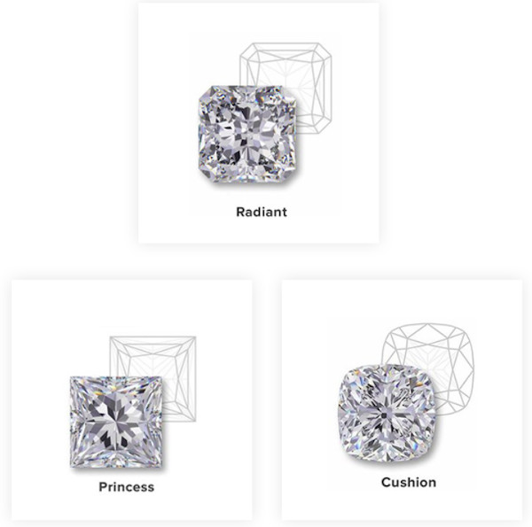 The two other options that are most similar to a radiant shape diamond are the princess cut diamond and the cushion cut diamond.