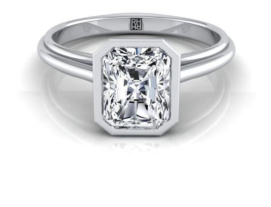 Our customers’ favorite setting for radiant diamonds is a simple radiant diamond band engagement ring. Halo engagement rings are also popular because they make your radiant shape diamond look larger thanks to the frame of diamonds around it. The geometric style of a radiant cut goes well in a bezel-set solitaire engagement ring. In a radiant three stone engagement ring, our customers generally or tapered baguettes on the side.
