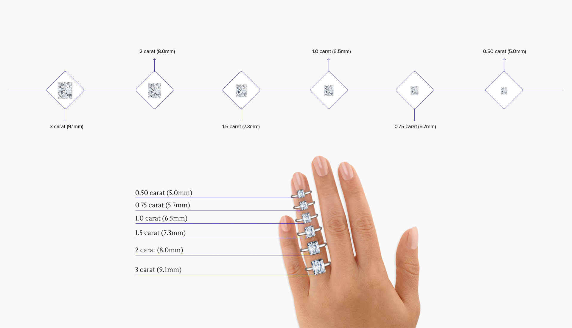 That means a two-carat radiant will look larger than a two-carat princess cut or round brilliant diamond. Only the oval cut looks as large. Look at the five two-carat diamonds below and see which shape looks the largest to you.
