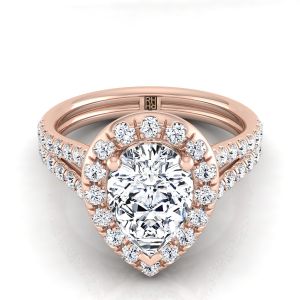 14K Rose Gold Pear Shape Center Diamond French Pave Split Shank Halo Engagement Ring -5/8ctw with a 0.80ct H, VS2 Pear Diamond