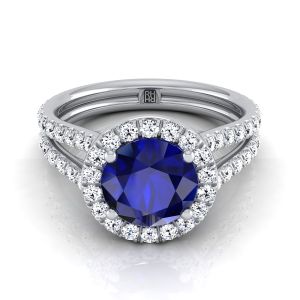 18K White Gold Round Brilliant Sapphire Halo Two Row Pavé Diamond Split Shank Engagement Ring -7/8ctw