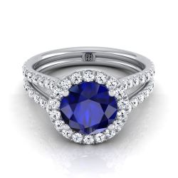 An Elegant Statement Of Style, This Sapphire Round Center With Halo Pave Engagement Ring Showcases Brilliant Cut Diamonds (h-i/vs 0.85ctw) With An Exquisite Pave Split Shank Mounted In A 18k White Gold Setting